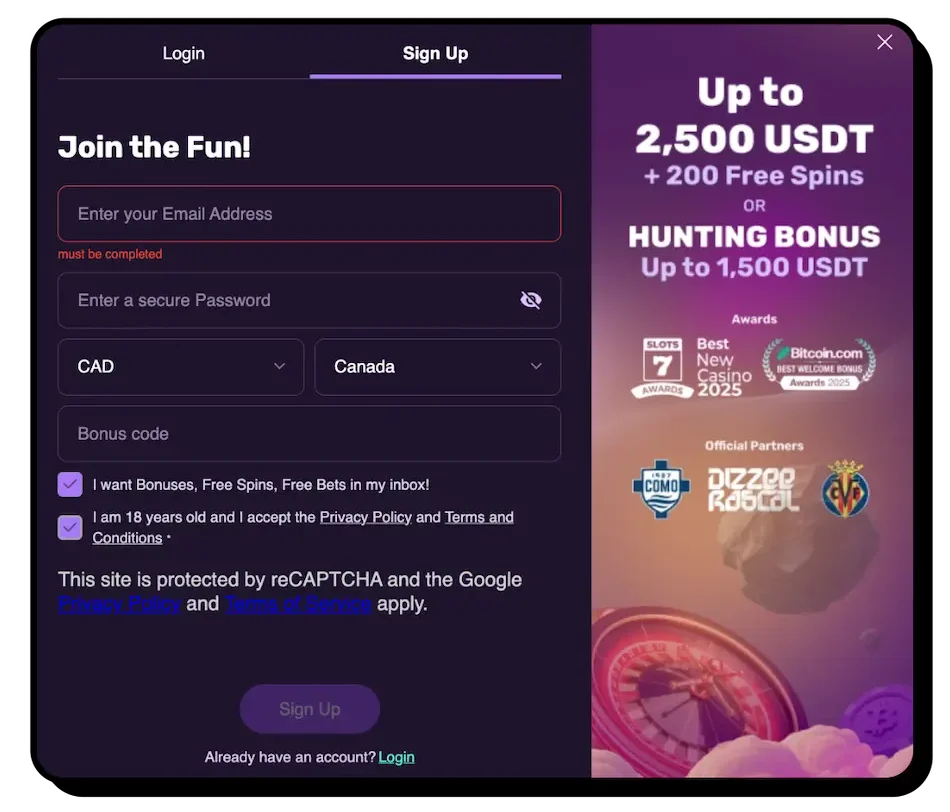 - Add email and password. Now, add more details. Enter the email address, create a strong password, choose the country Canada, currency CAD and enter a bonus code. We advise you to create a password combining symbols, numbers and letters for added safety.