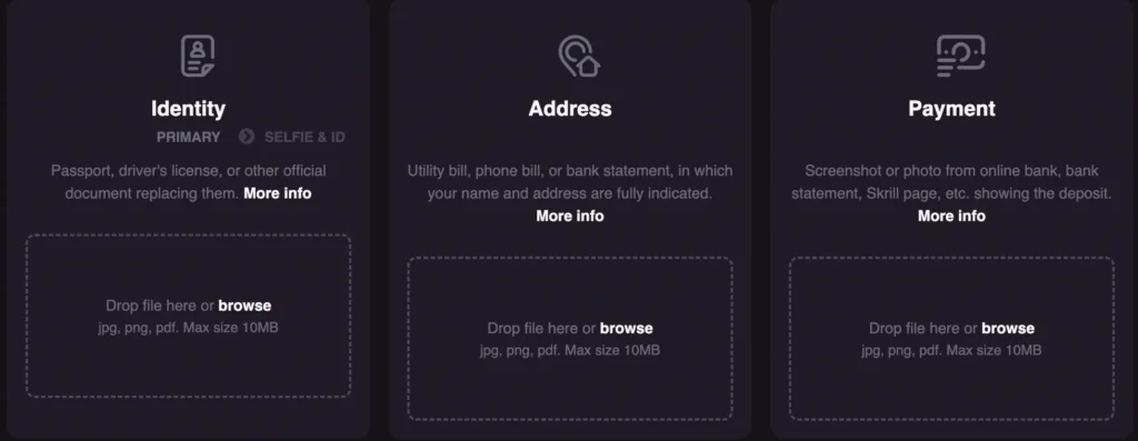 The sign up process doesn’t require account verification or KYC immediately after, but rather before the initial withdrawal, where you need to submit photos of government-issued documents, a utility bill and payment information. But players have the ability to complete this immediately after they have created an account, in order to speed up the initial withdrawal request.